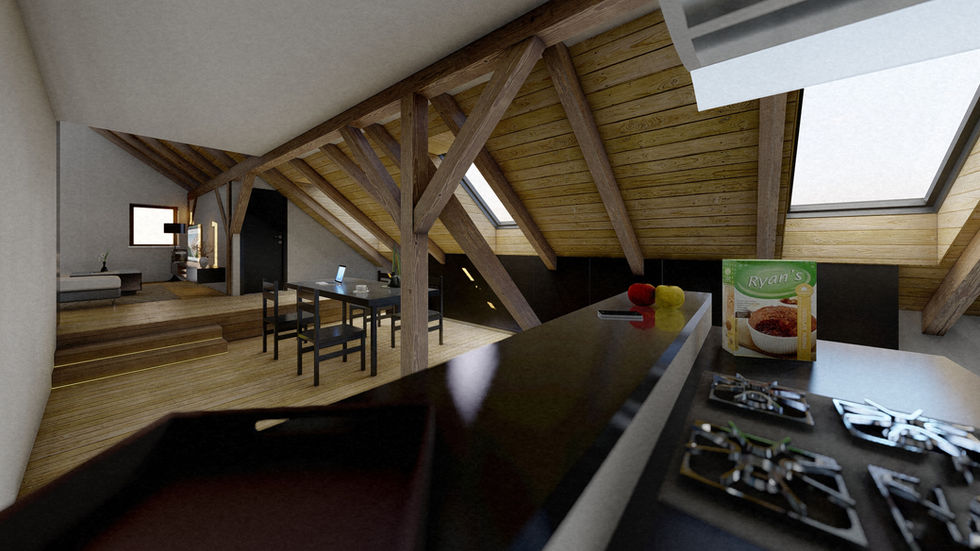 V této spolupráci bylo mým úkolem provést prvotní dispoziční návrh tak, aby bylo možné realizovat půdní obytnou vestavbu v krásném historickém rodinném domě na malé vsi. Hlavní vchod bude proveden pomocí ocelového schodiště ze severozápadního štítu objektu tak, aby nebylo nijak rušeno soukromí původní bytové jednotky v 1.NP.